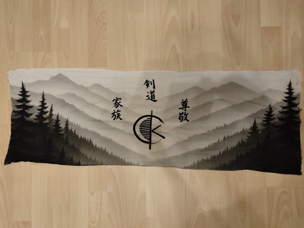 Das Tenugui greift sowohl unsere regionalen Wurzeln im Schwarzwald als auch unsere drei Leitsätze auf und stellt das Dojo Symbol zentral in den Mittelpunkt.